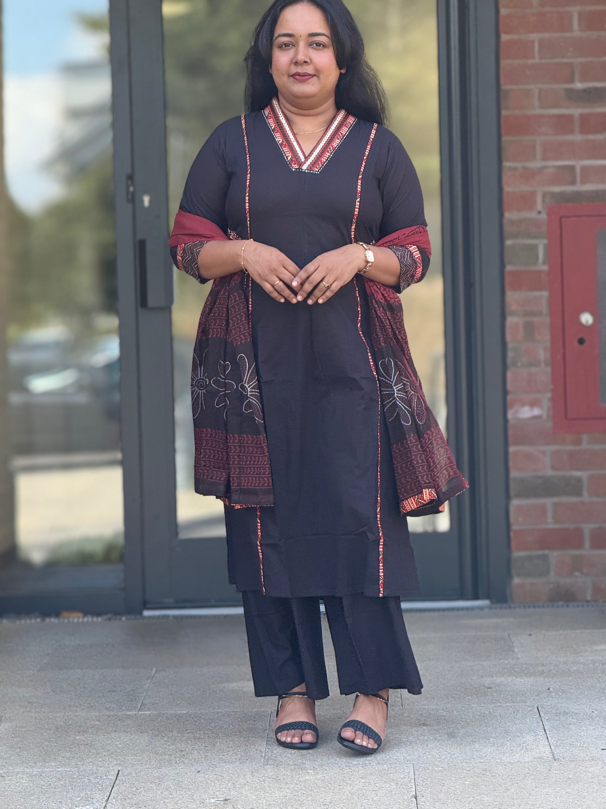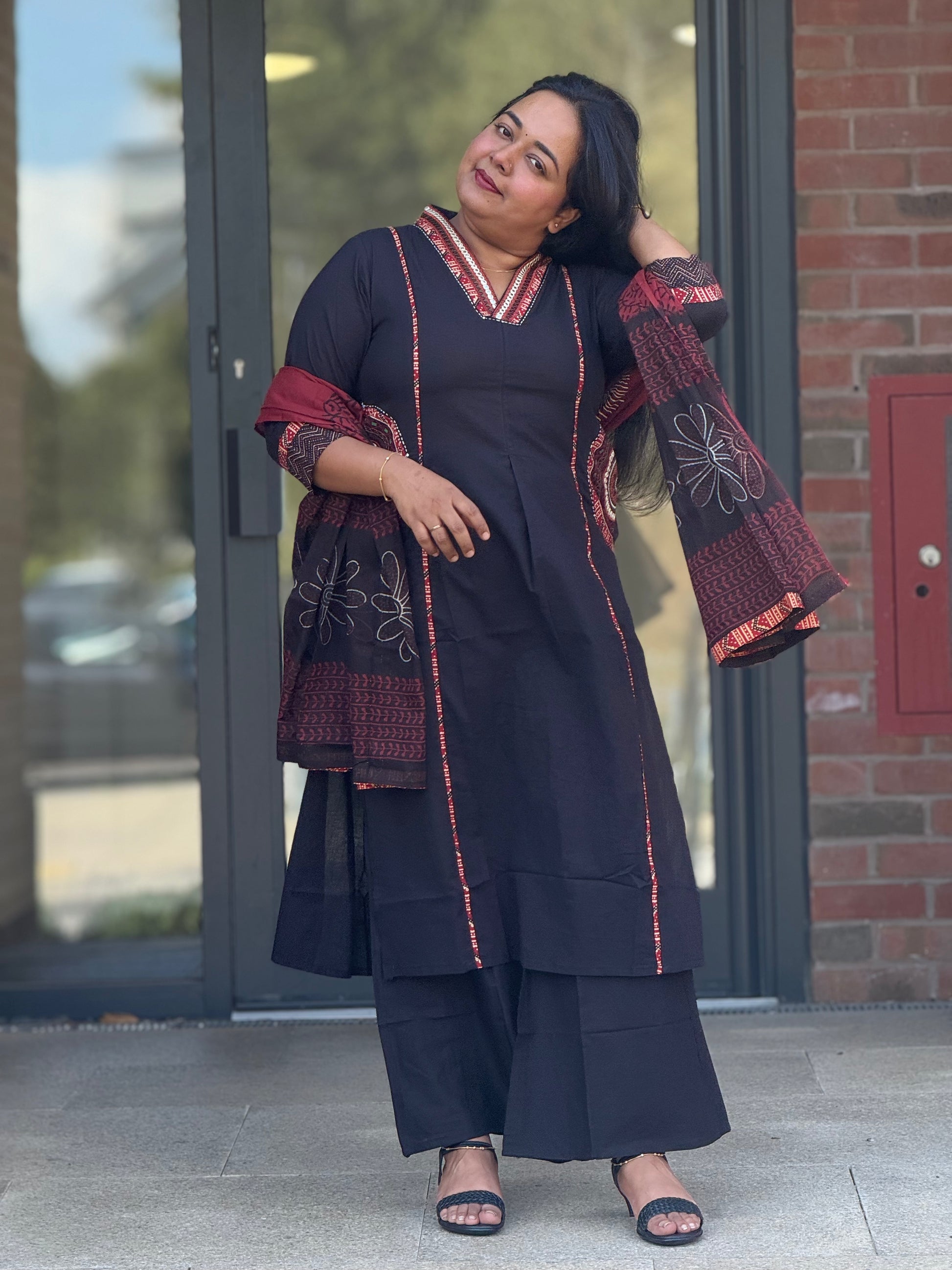 Step into elegance with this beautifully crafted soft and breathable cotton blend black salwar suit featuring subtle red embroidery and a graceful dupatta with wide palazzo pants for a flow fit . It comes with two side pockets - because comfort and fashion should go hand in hand .