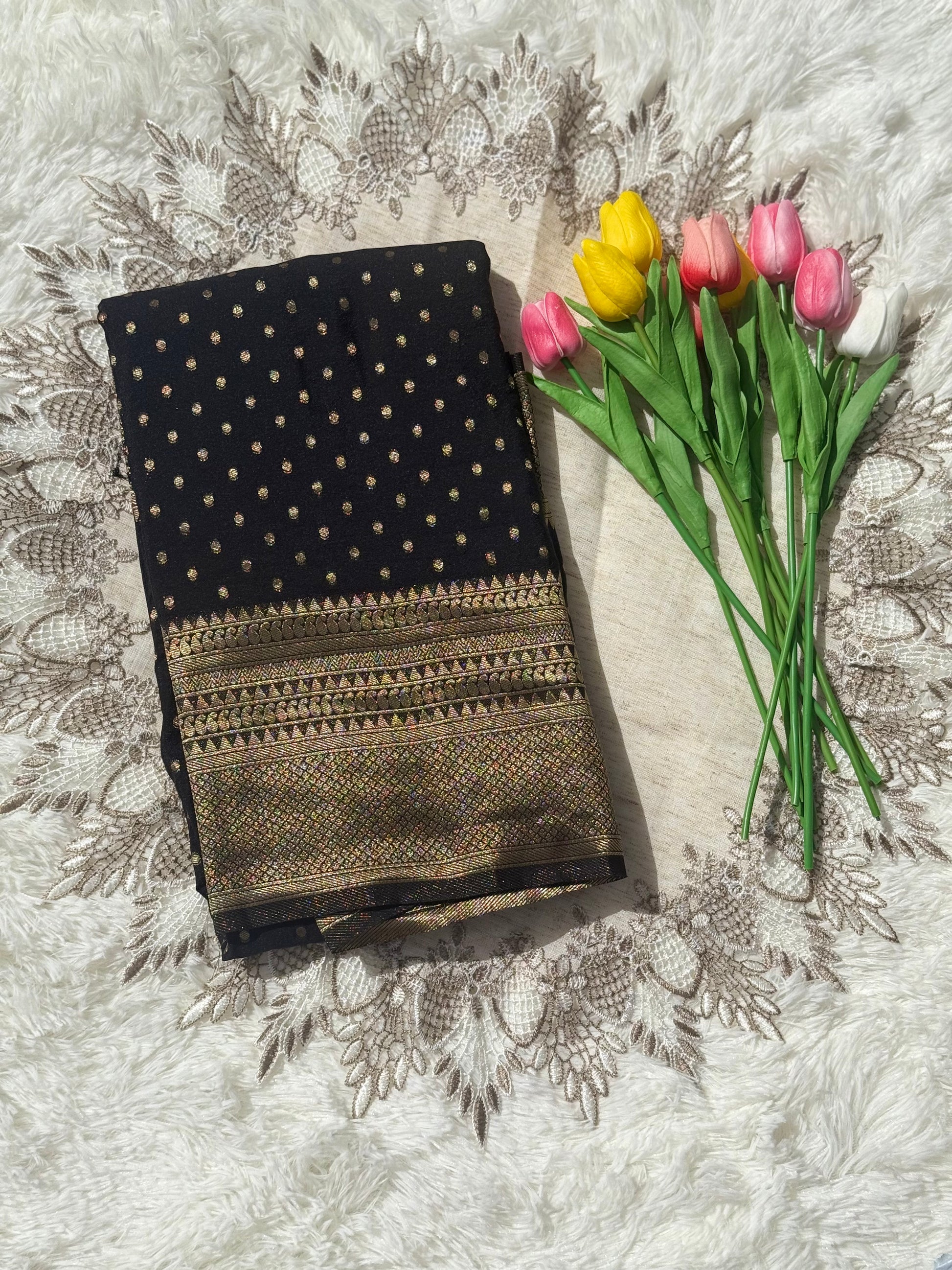 This elegant black Banarasi silk saree features exquisite antique gold zari weaving, creating a timeless look perfect for weddings and festive occasions. The delicate polka dot pattern across the body adds a subtle charm, enhancing its sophisticated appeal. Crafted with rich silk, this saree offers both luxury and grace for memorable celebrations.