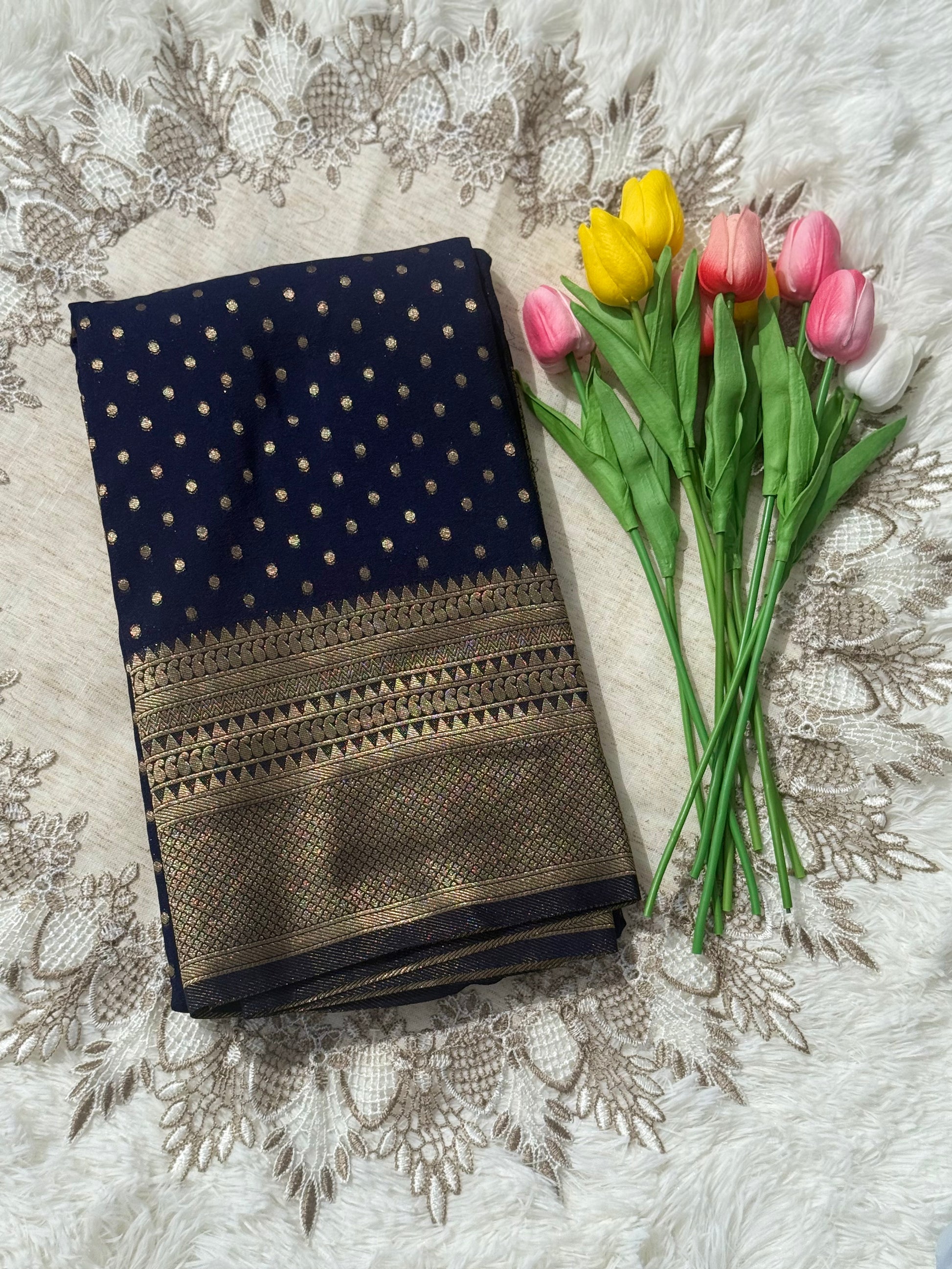 Embrace timeless elegance with this royal midnight blue bananas silk saree, featuring delicate golden zari polka dots that add a subtle shimmer. The rich traditional border enhances its classic appeal, making it perfect for special occasions where sophistication is key. This saree combines luxurious texture with intricate craftsmanship for a graceful and refined look.onal border .