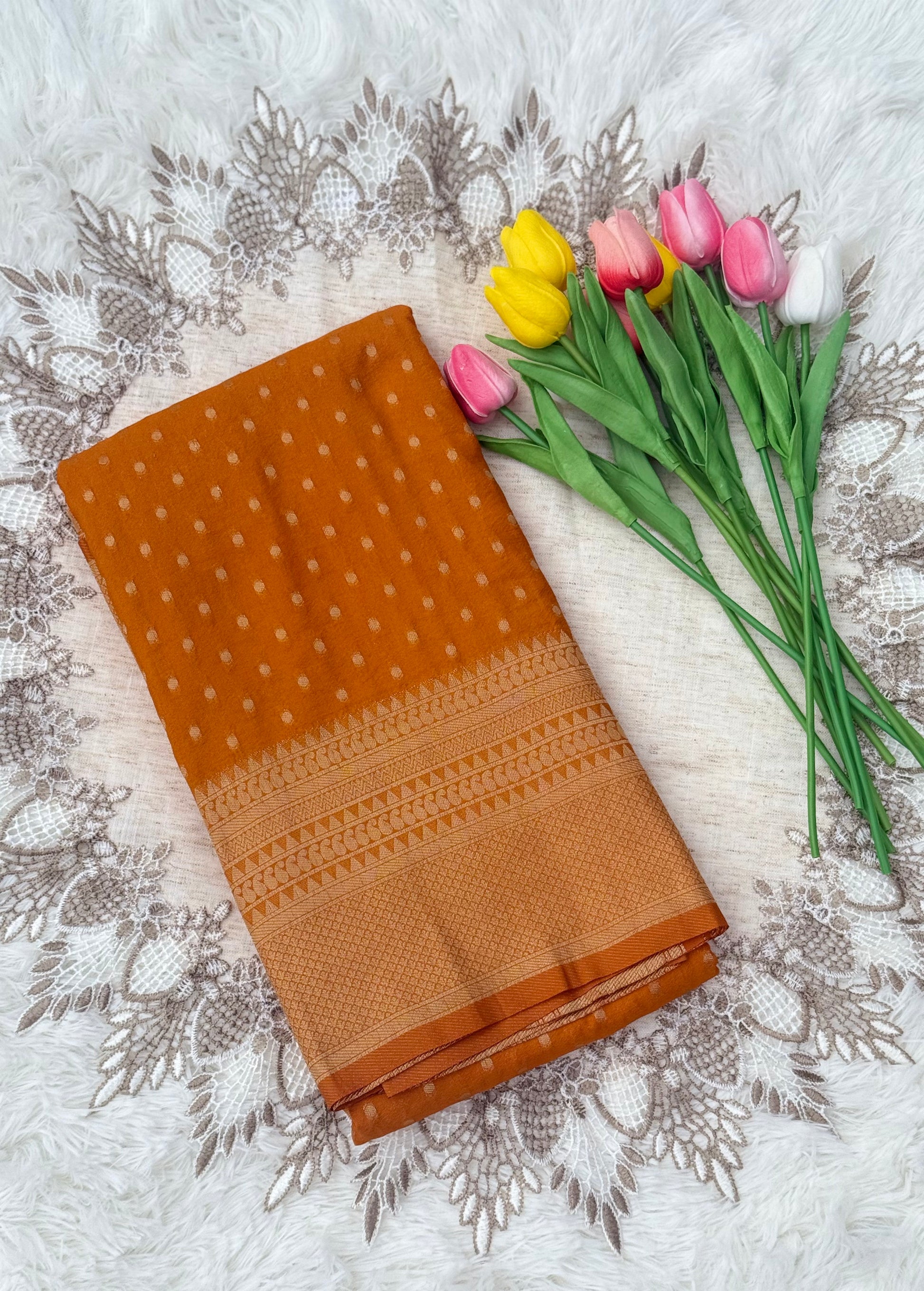 This elegant rust orange silk Banarasi saree features a luxurious golden weave border and delicate polka dots scattered across the body, creating an elegant and timeless look. Ideal for festive occasions and refined gatherings, it combines traditional craftsmanship with sophisticated style.